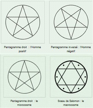 Ces cinq éléments, la conscience et ses quatre corps, étaient symbolisés par l’étoile à cinq branches ou pentagramme. Les alchimistes du Moyen Âge connaissaient ce signe comme l’étoile de Bethléem et quand il a été montré inversé comme le symbole diabolique du sabot fourchu. Selon le système de géométrie de Pythagore, le tablier maçonnique avec ses quatre coins et le point descendant de sa jupe triangulaire symbolisent la même chose. La jupe basse symbolise le meurtre d’Hiram; le ressusciter, sa résurrection.