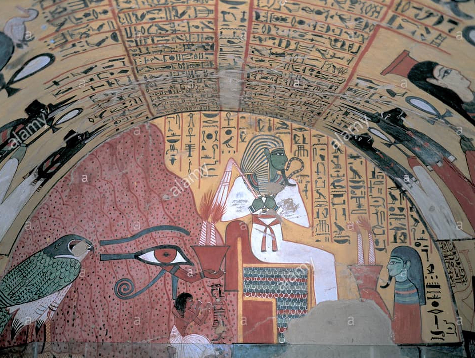 Le mythe dit qu’Horus, fils d’Isis et d’Osiris, aurait perdu un œil dans le combat mené contre son oncle Seth pour venger l’assassinat de son père. Au cours du combat, Seth lui arracha l’œil gauche, le découpa en six morceaux et jeta les morceaux dans le Nil. À l’aide d’un filet, Thot repêcha tous les morceaux sauf un. Thot le rajoute et rend donc à Horus son intégrité vitale. Et lui donne par l’ajout une fonction supérieure. C’est donc un symbole protecteur fort.