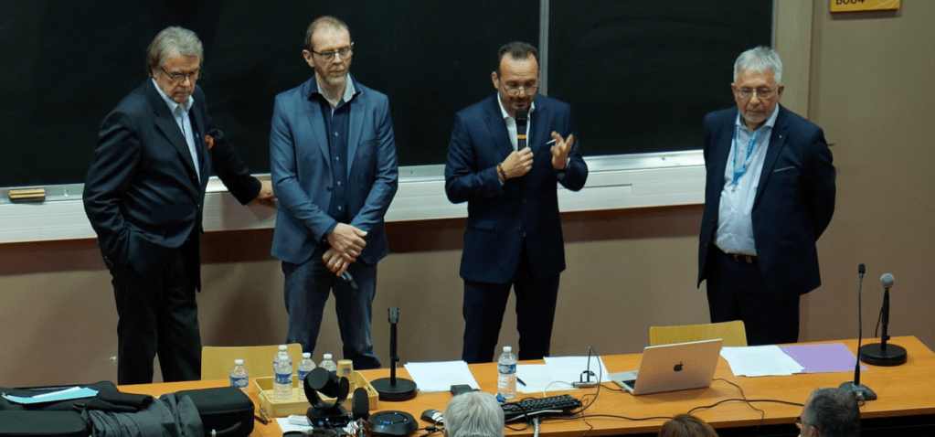 De gauche à droite: – Alain Graesel, conférencier, – Jérome Azé, professeur des universités et directeur de l’IUT, – Fabien Portes, Président de l’IUT de Béziers, organisateur, – Alain Aussenac, Administrateur IUT de Béziers, organisateur.
